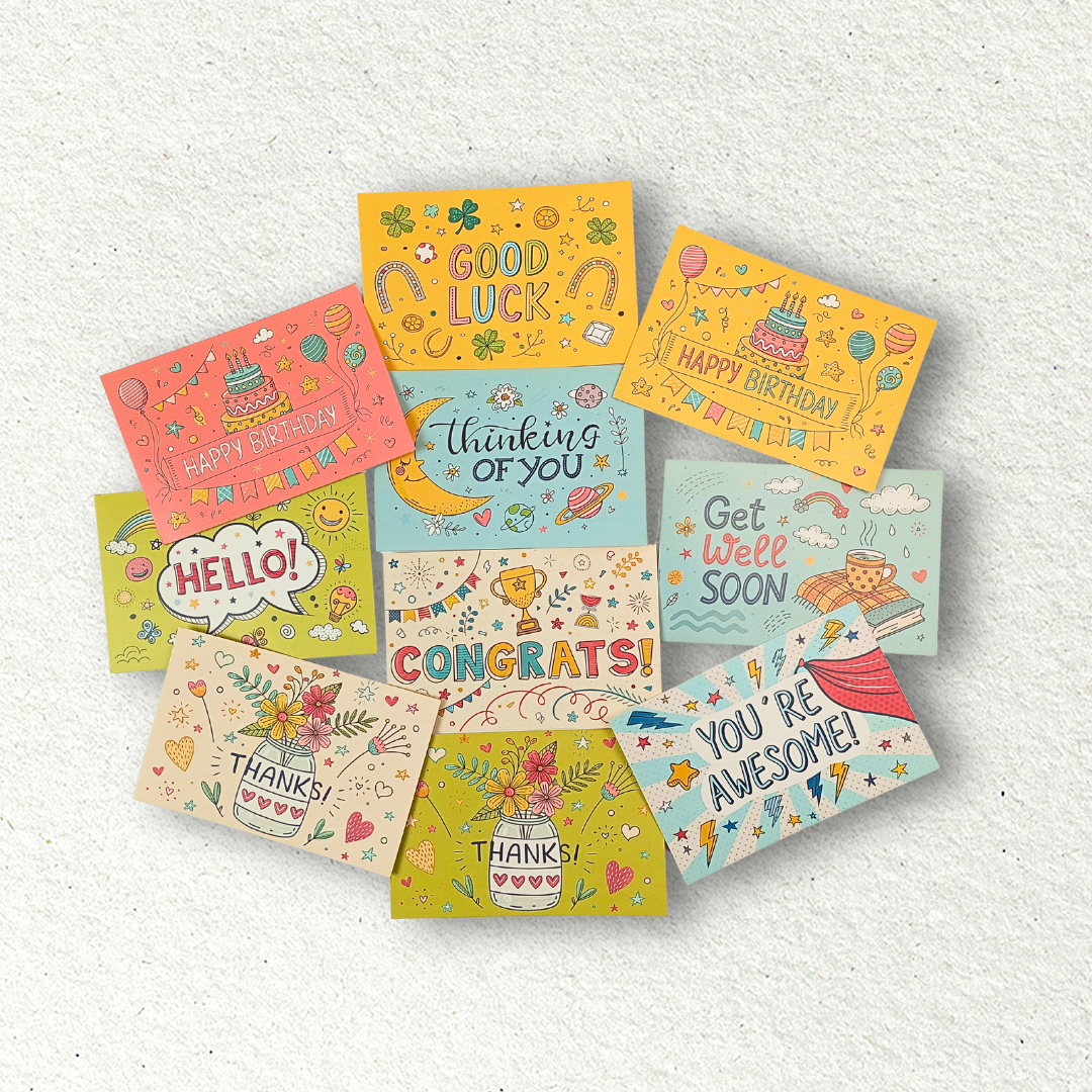 Introducing our Greetings-themed Postcard Box—a curated collection of beautifully crafted postcards. Each box includes authentic stamps, a handy guide, and a sleek pen.
